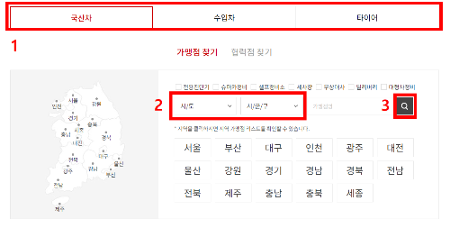 1. 아래의 “예약하기” 버튼 클릭 하면, 지점 찾기 화면으로 이동합니다. 먼저 국산차, 수입차, 타이어 옵션을 선택 한 후, 시도와 시/군/구를 선택합니다. 그리고 마지막으로 오른쪽에 위치한 돋보기 아이콘을 누릅니다.