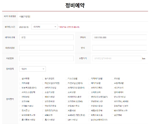 3. 예약 시간, 성함, 연락처, 차량모델, 연식, 차량번호, 주행거리, 정비항목 등을 입력 또는 체크합니다. 그리고 제목과 내용을 적어 "등록" 버튼을 클릭하면, 모든 예약 절차가 완료됩니다.