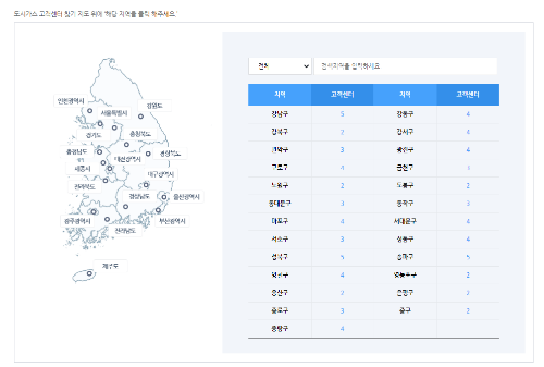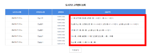 2. 선택한 지역을 표로 보여줍니다. 지역/고객센터 표에서 해당지역을 클릭하면 구별, 동별 도시가스사명, 지역관리소명, 전화번호, 관할구역이 나옵니다. 참고로, 해당 지역의 전화번호로 문의하시면, 유선상으로 가스요금을 확인해 보실 수도 있습니다.