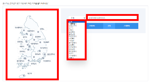 1. 아래의 "도시가스 요금 조회하기" 를 클릭하면, 한국도시가스협회 지도나 보이는 화면으로 이동하게 됩니다. 본인의 거주지역을 지도에서 클릭하거나, 오른쪽의 검색지역에 선택, 입력합니다.